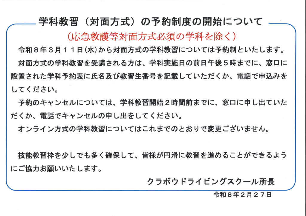 2026.02.27 学科教習(対面方式)の予約制度の開始について